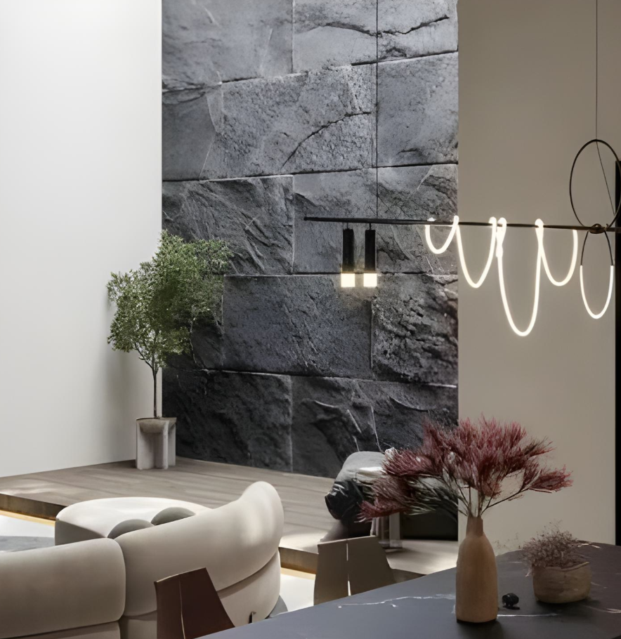 The EVEREST model is distinguished by its dynamic, irregular texture, reminiscent of naturally split rock. It has numerous folds, indentations and sharp edges that create a distinct 3D effect. It is an ideal choice for interiors that are to gain a distinct character and refer to the raw beauty of nature.