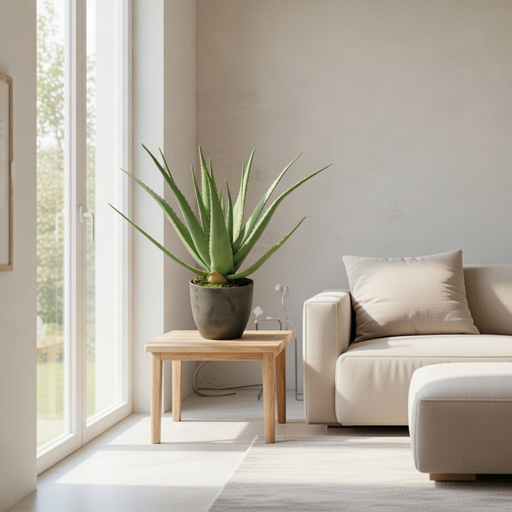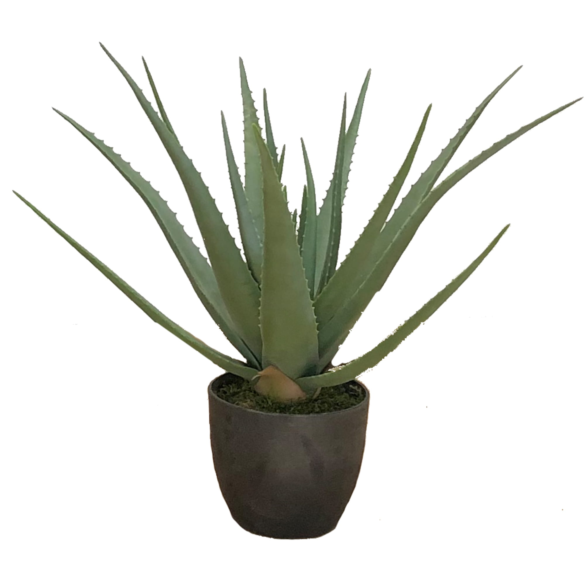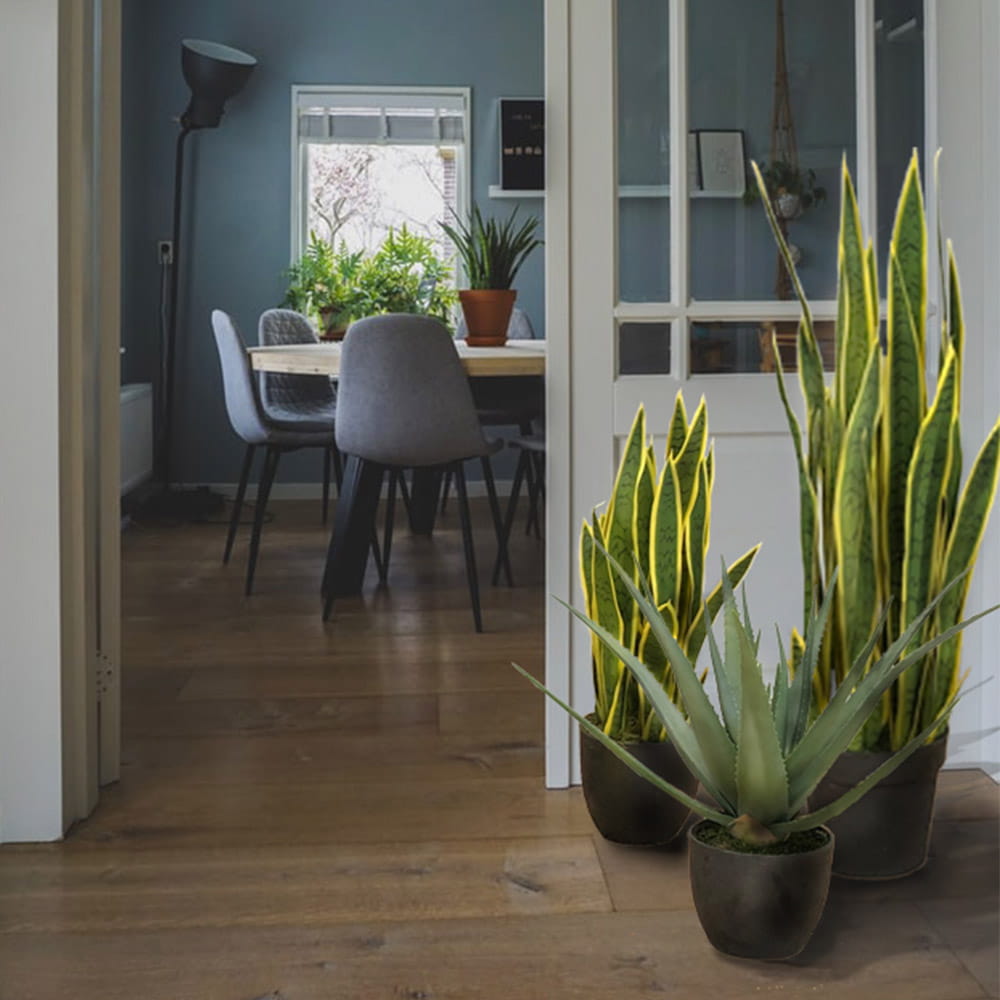 Meet Aloes, a meticulously crafted artificial plant sold complete with a sleek black pot. Every detail has been perfected to mimic its natural counterpart flawlessly. It stands securely in a plastic base, topped with delicate moss that enhances its realistic appearance. Made from high-quality rubber, its texture is indistinguishable from a real plant to the touch, ensuring durability without the risk of leaf breakage.
